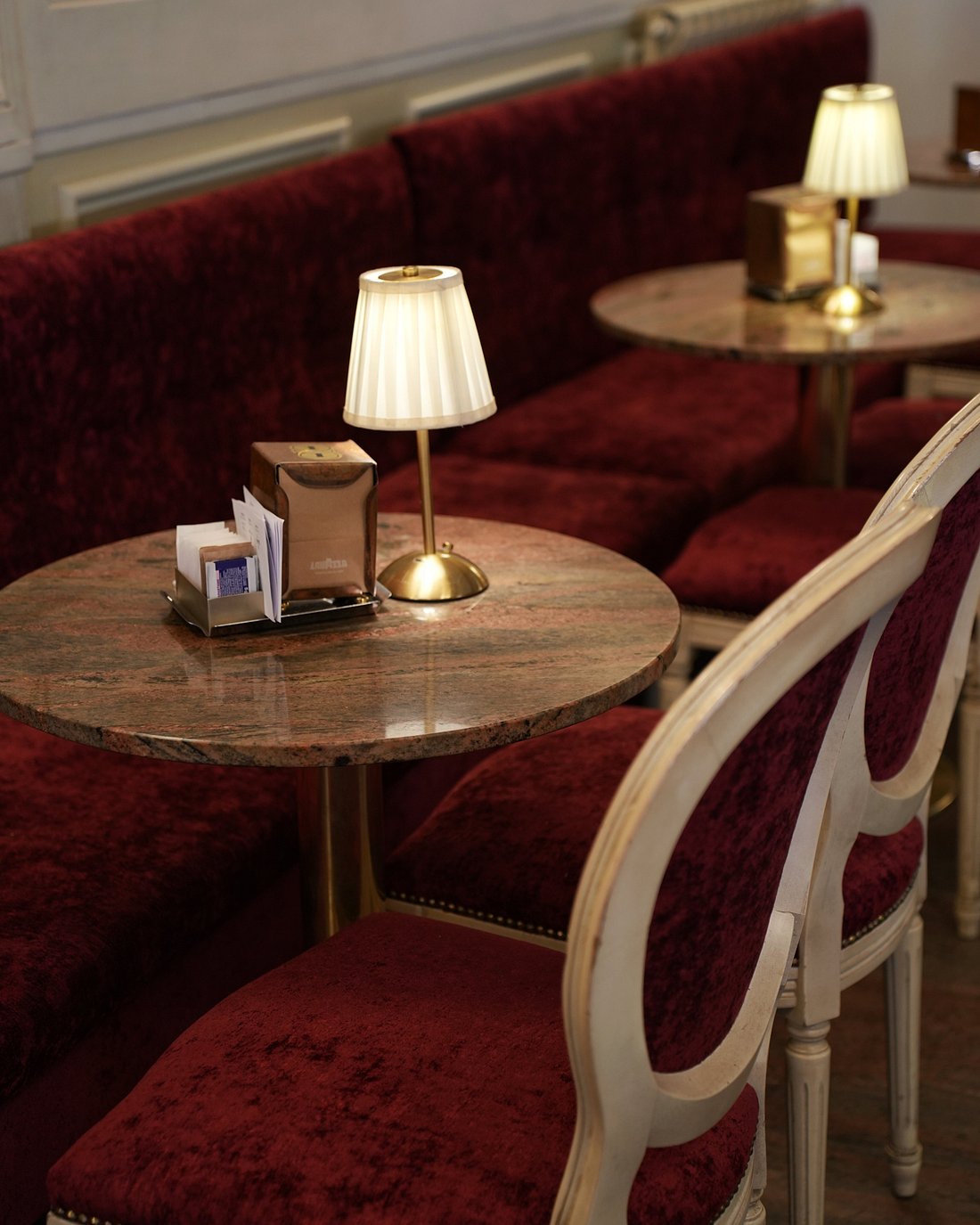 Un insieme di velluti, servizio di caffè curato, confezioni regalo e dettagli di pasticceria — elegante, classico e un po' teatrale, nel senso migliore.